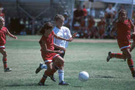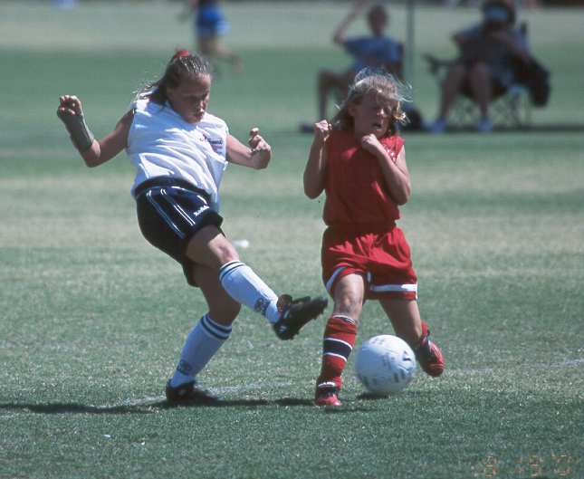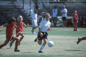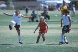 Three Andromeda players chase the ball.